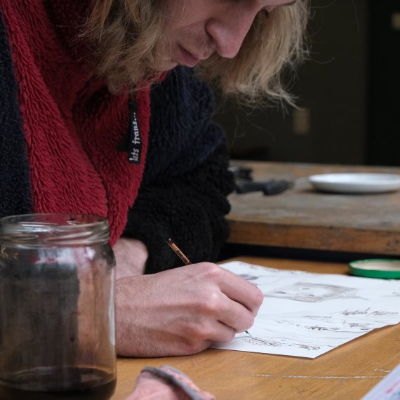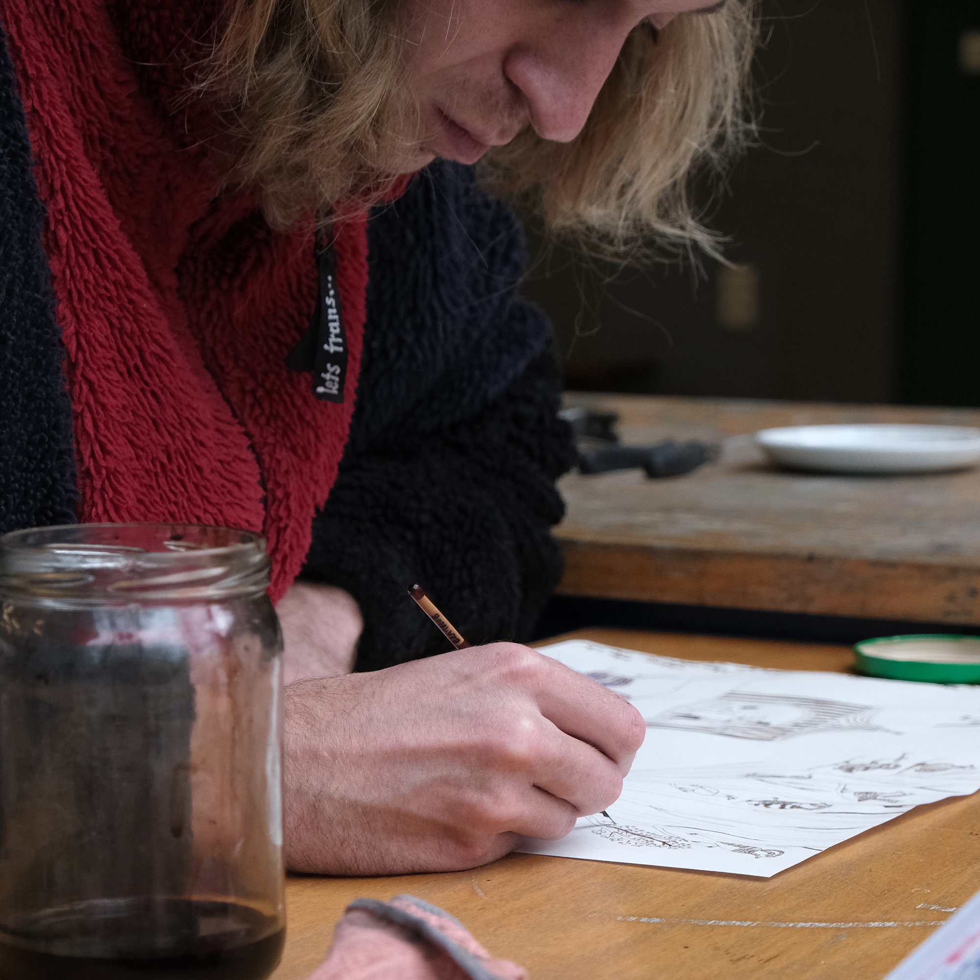 Arthur Devisscher studeerde illustratie aan LUCA School of Arts, Campus Sint-Lucas Gent. Tijdens het werken ontplooien zijn verhalen zich in beelden die een ode brengen aan de natuur en het dierenrijk. Tijdens de kunstenaarsresidentie in Destelheide wil deze tekenaar verder onderzoeken hoe tekst in zijn beelden verwerkt kan worden. Hij zal hierbij verdwijnen in zijn werk, ronddwalen, en hopelijk weer verschijnen.