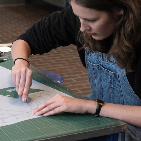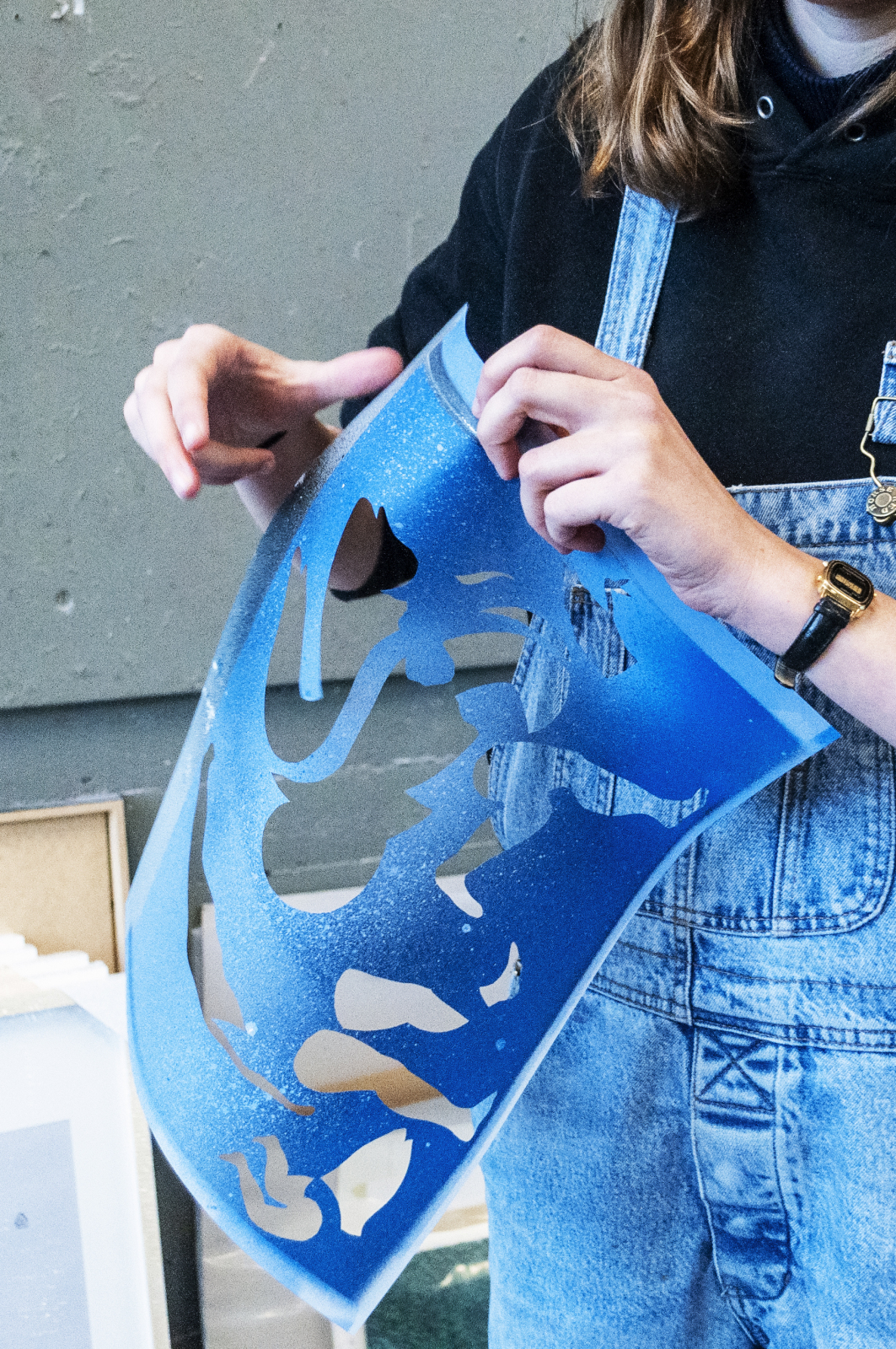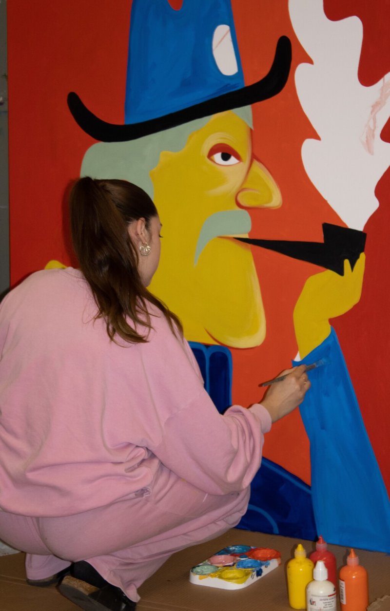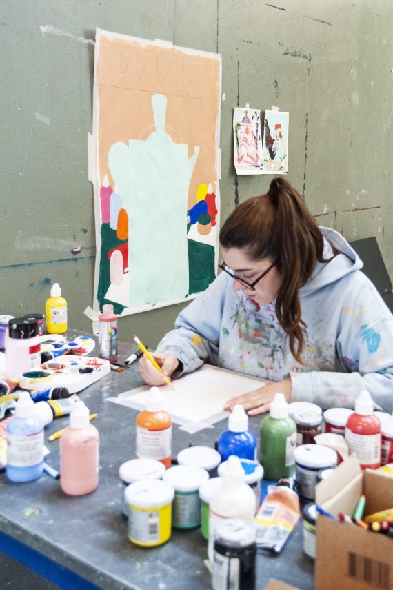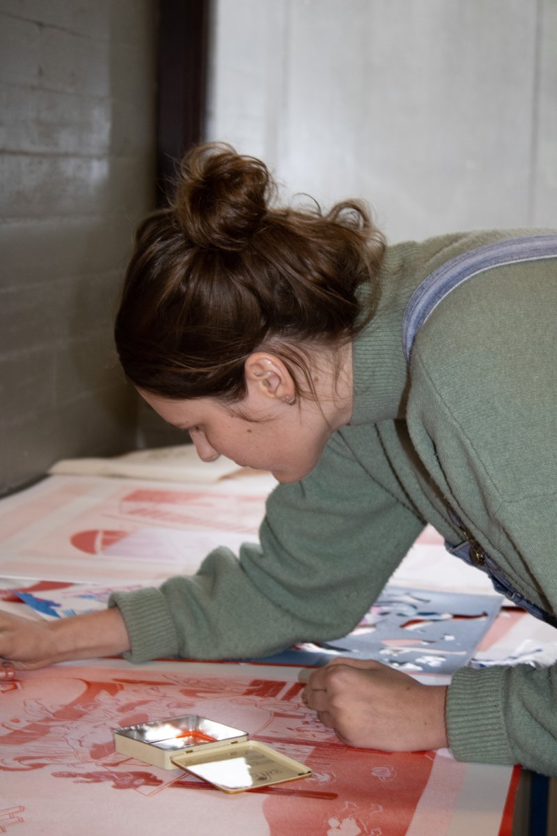 Illustrator Jeanne Ribbens woont en werkt in Antwerpen. Naast het vormgeven van gezelschapsspelen en speelgoed komt de liefde voor het spelen ook terug in haar eigen artistieke praktijk. Met muurschilderingen en via druktechnieken als zeefdruk en risografie creëert ze beeldverhalen die getypeerd worden door felle kleurcombinaties en overlappingen. In deze fantasierijke composities krijgt de ruimte een even grote narratieve rol toegekend als de personages die zich erin voortbewegen.