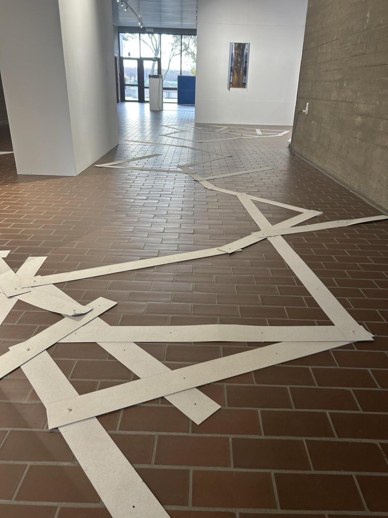 Gert De Clercq blijft bewust weg van kleur, want dit geeft een werk snel een extra betekenis. Voor hem kan kleurgebruik wel, maar het moet een verantwoorde keuze zijn. Voor dit werk gebruikte hij bewust karton zodat het drempelverlagend zou werken om er interactief mee aan de slag te gaan. Je mag het verschuiven, aanpassen, zaken weghalen of toevoegen en er zelfs op stappen. Gert blijft weg van het punt dat een kunstwerk iets definitief zou krijgen. Dankzij goedkope, banale materialen te gebruiken versterk je dit gegeven. De kartonnen vlakken zijn aan elkaar gehecht met boekbinderschroeven en doet daardoor denken aan het nostalgische beeld van marionettepopjes maken uit karton. Net als een rizoom kan het blijven groeien en wijzigen, waardoor het geen definitief karakter heeft. Het verbindt de verschillende delen van de expo.