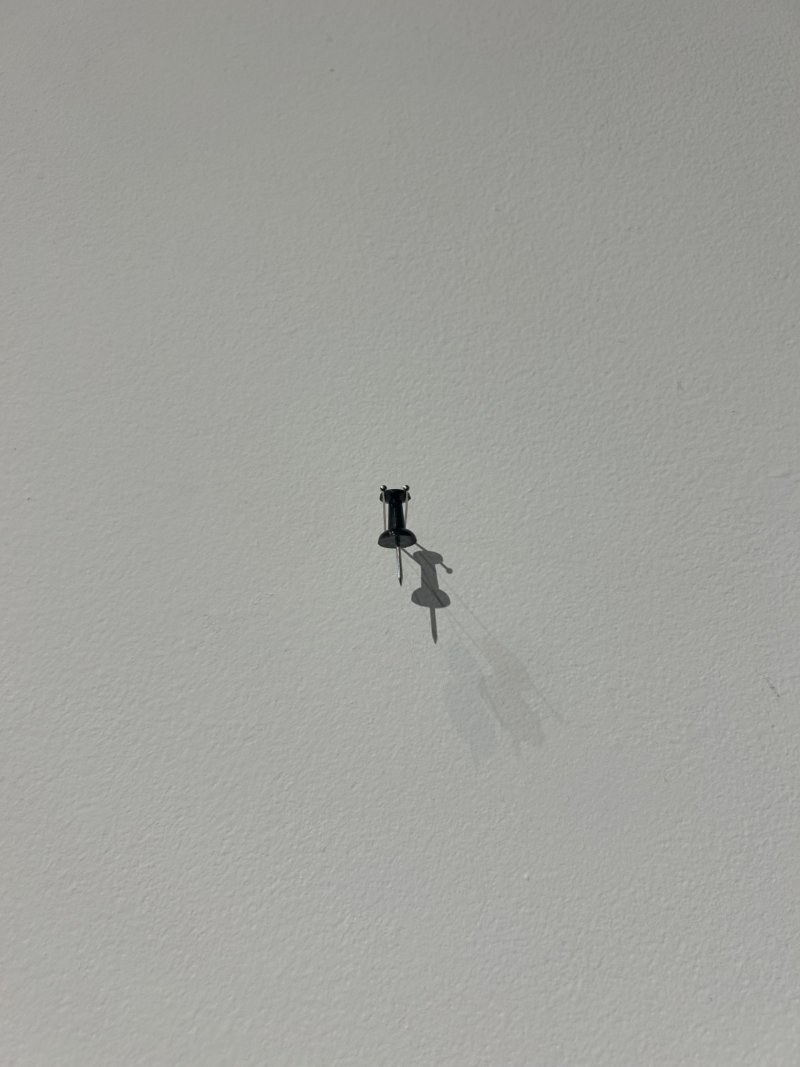 Een duimspijker die een samenwerking aangaat met andere materialen die iets kunnen ophangen. Hij wordt door de museale context een kunstwerk, maar verliest ook alle waarde doordat het geen functie meer kent. Het is interessant dat zo’n klein, onbenullig object een hele muur inneemt en visueel zijn kracht heeft. De mogelijkheden zijn er om met de duimspijker aan de slag te gaan, de draad die er voorbij loopt om zaken aan op te hangen, … maar er wordt niets mee gedaan.