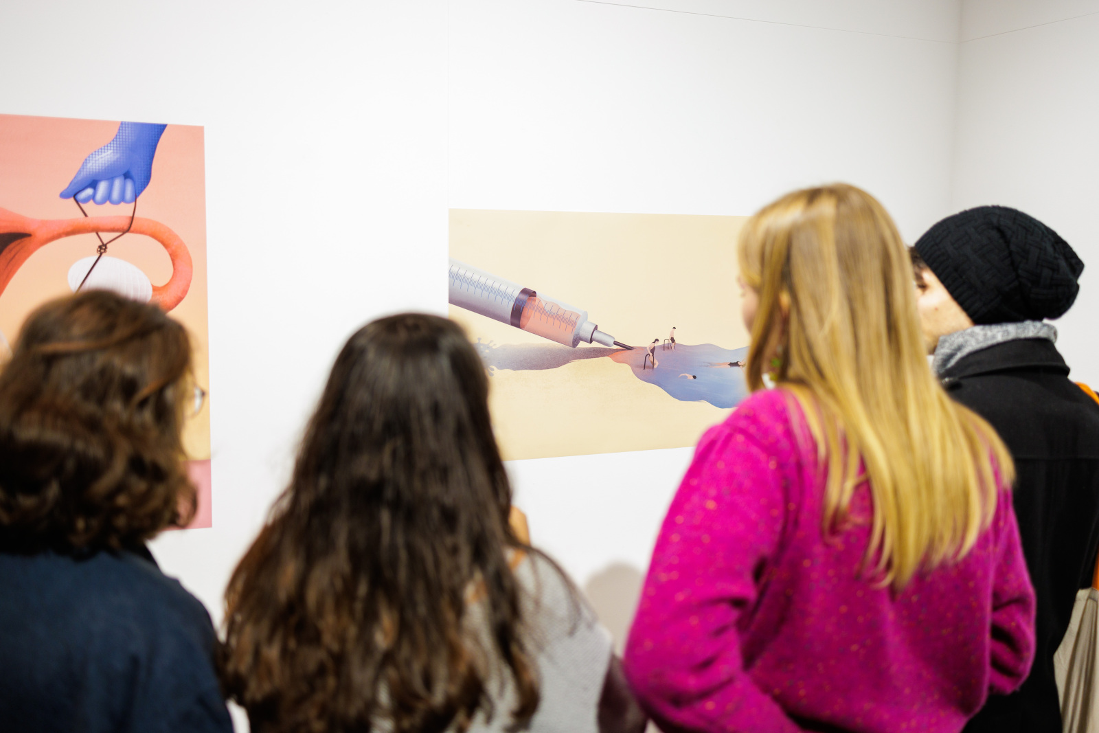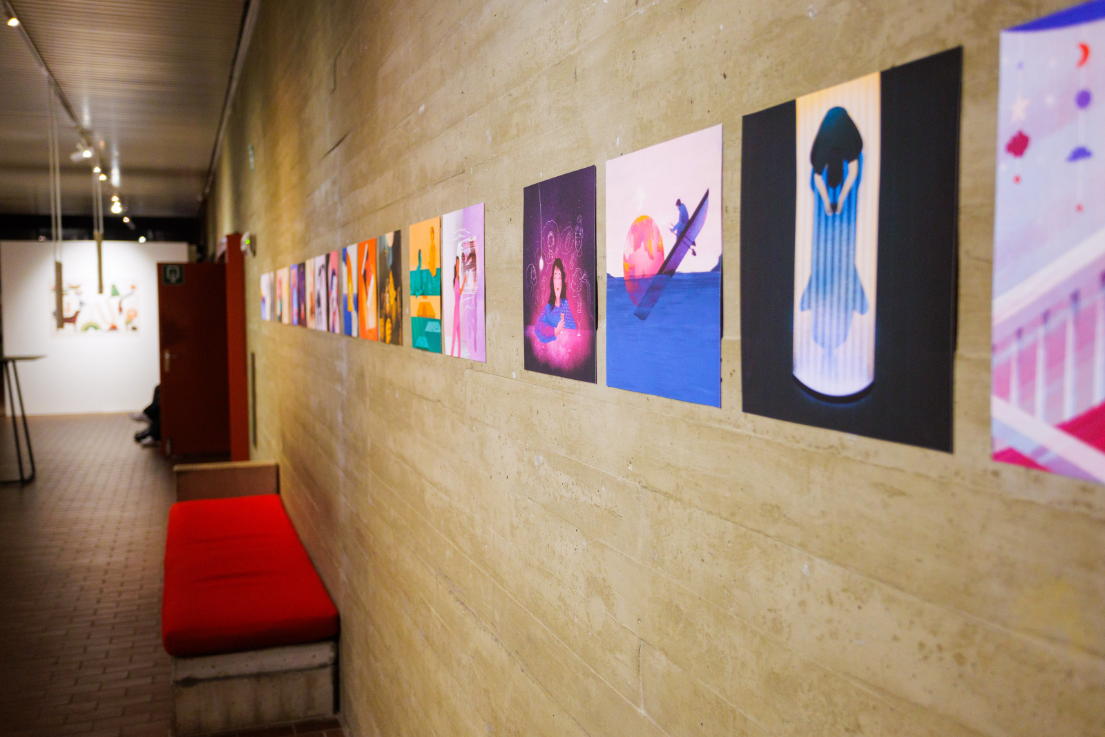 Flore Deman: ‘Dit is inderdaad echt een primeur. De werken die hier te zien zijn, zijn op deze schaal nog nooit getoond. Vaak zien mensen mijn illustraties digitaal, op Instagram of in publicaties, maar groot uitgeprint en tentoongesteld? Dat was nieuw voor mij. Ik ben heel tevreden over hoe het eruitziet. Het was moeilijk om vooraf in te schatten of alles tot zijn recht zou komen. De expohal van Destelheide is een grote ruimte, dus je moet rekening houden met de compositie. Sommige prenten hebben we heel groot gepresenteerd, andere juist klein. Curator Steffi Mareel speelde daar een belangrijke rol in. Zij heeft een objectieve blik en veel ervaring. Waar ik vooral naar de achtergrond en het doel van mijn werk kijk, ziet zij iets nieuws. Dat hielp enorm om een gevarieerde en hopelijk ook verrassende tentoonstelling te maken voor de bezoekers.’