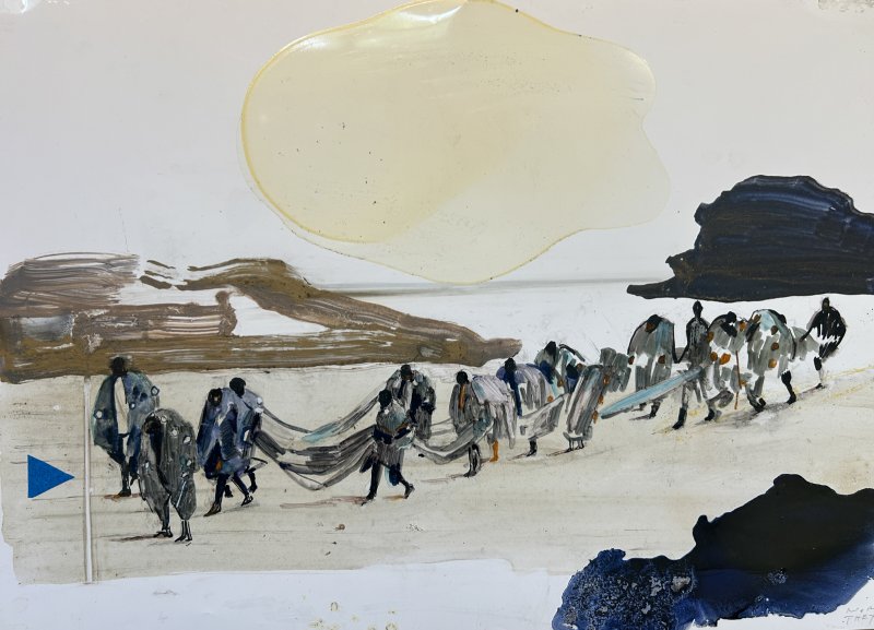 "Sommige werken vertellen een heel duidelijk verhaal. Zoals dit werk waar je mensen ziet die een betere toekomst zoeken, die samen zijn aangekomen – vluchtelingen, die netten meezeulen die ze gevonden hebben, bvb in boten. Maar wat ik zo schrijnend vind, is dat ze toekomen en dan vaak weer teruggestuurd worden. Door links in het werk een verticale lijn te trekken met daarachter een ‘play’ driehoekje, toon ik aan dat ze tegengehouden worden, als een soort pauzeknop."