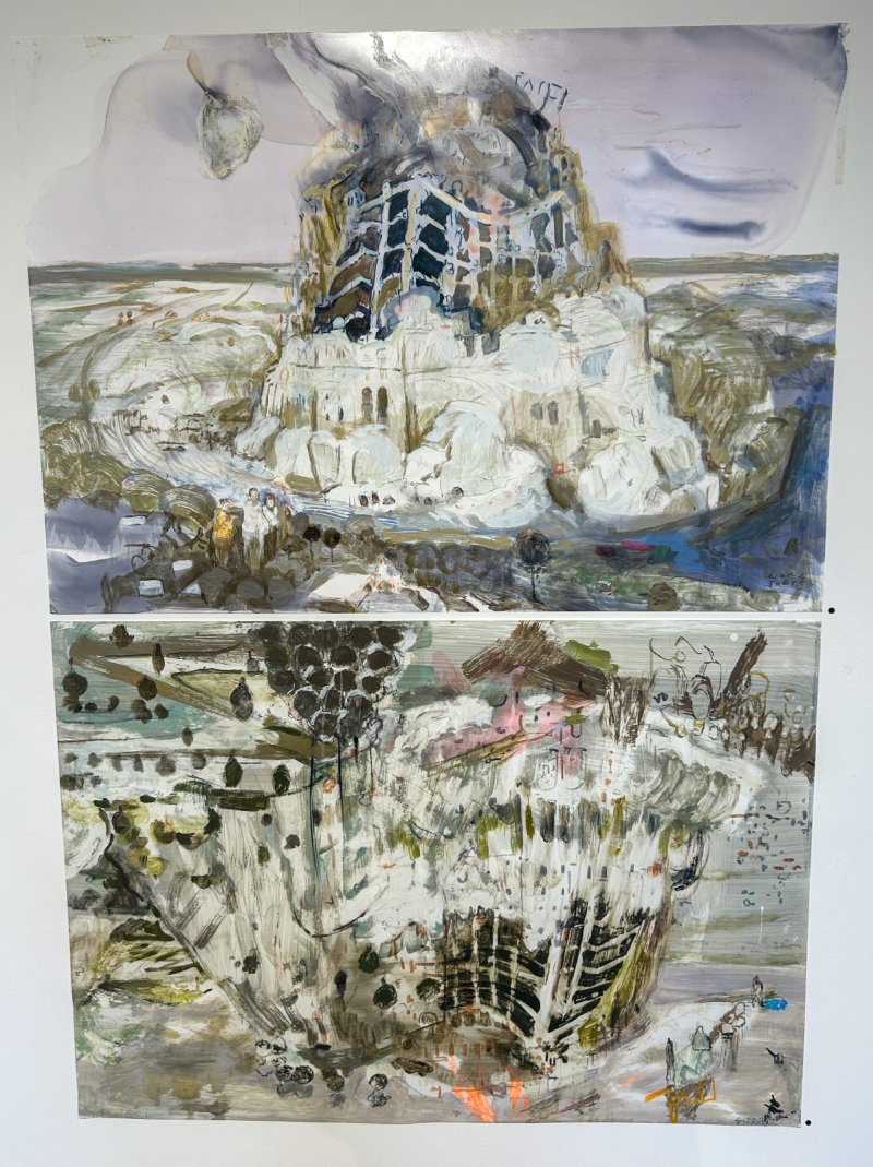 "Hier zie je twee werken die vertrokken zijn vanuit De Toren van Babel van Pieter Bruegel De Oude. Een werk dat ook in het groot geprint werd om aan een van de gevels van de slaapblokken van Destelheide te hangen. De link met mensenrechten en actualiteit is hier voor mij erg aanwezig. Als je denkt aan wat er allemaal gebeurt in o.a. Gaza… De mensen spreken niet meer met elkaar, ze zijn van elkaar vervreemd. Voor deze schilderijen heb ik me enerzijds op De Toren van Babel gebaseerd, anderzijds op beelden van bombardementen in de actualiteit. Het onderstaande werk wou ik er graag bijhangen, maar ik vond niet meteen goed hoe dit visueel paste. Het is pas toen ik het ondersteboven draaide, dat er een interessante wisselwerking tussen beide schilderijen kwam. "