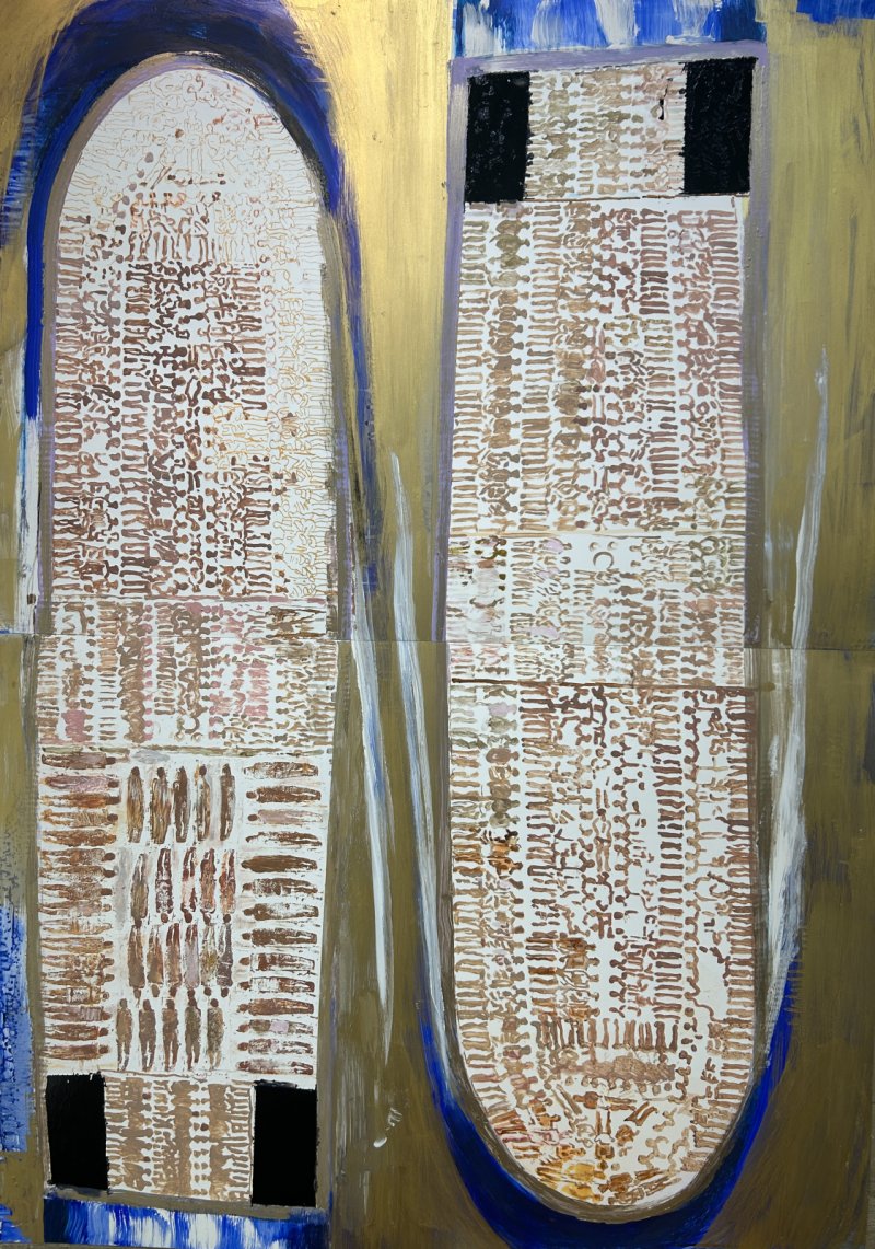 "Ik had net voor dit werk goudpigment gekocht en wou dit heel graag gebruiken. Hier zie je een verzopen landschap, waar enkel water achtergebleven is. Het enige kleur dat ik wou was dus het oranjeachtige van dat goud en het complementaire van het blauw."