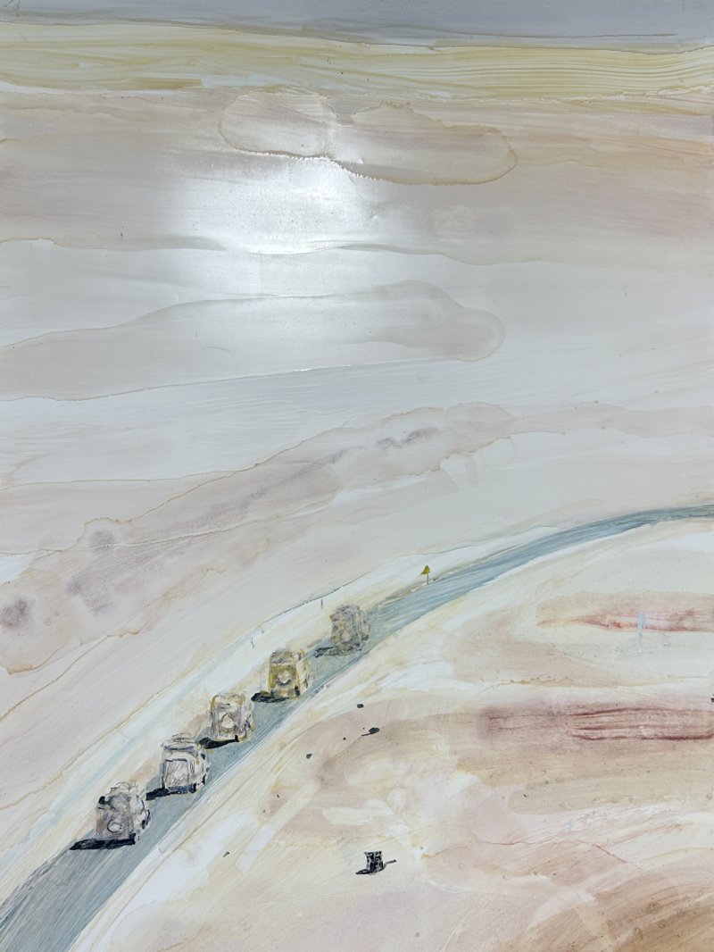 "Dit refereert aan mensenrechten. Hier zie je nood- en voedselhulp. Je ziet oude jeeps die tot de verbeelding spreken. Het landschap is dan weer heel neutraal, waardoor het geen specifieke indicatie van plaats geeft en het meer een overkoepelende thematiek aangaat. Dankzij de kleuren wordt het een bijna dromerig beeld. Het is ook dit werk dat op groot buitendoek geprint is en aan de gevel van Hanenbos hangt."