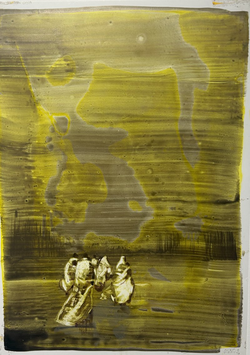"Hier zat ik dagen aan te werken, maar omdat ik weinig geduld heb, snel iets beu ben, zoek ik naar manieren om sneller te kunnen gaan. Hier zijn de figuren uiteindelijk gestempeld. Dit werk is initieel vertrokken vanuit prenten uit midden 19de eeuw, over slaventransport. Toen kwam terwijl ik hieraan werkte, het bericht van Trump die mensen wilde terugsturen naar Zuid-Amerika in de actualiteit. Hierdoor zag ik er boten in die voor Trump dienden. Heel kort daarna was het veel in het nieuws over de ruimtetuigen van Musk om naar Mars te gaan, waardoor ik dan weer dit erin zag en het bijna iets absurds krijgt. Dat politieke klimaat heeft zich mee in het werk genesteld. Tegelijk vertrek ik dus vaak vanuit mijn beeldenbank die ik doorheen de jaren heb verzameld: ik kijk veel, ik laat me leiden door verontwaardiging of fascinatie. Een beeld moet me prikkelen en dat bewaar ik dan om later als vertrekpunt in te zetten. "