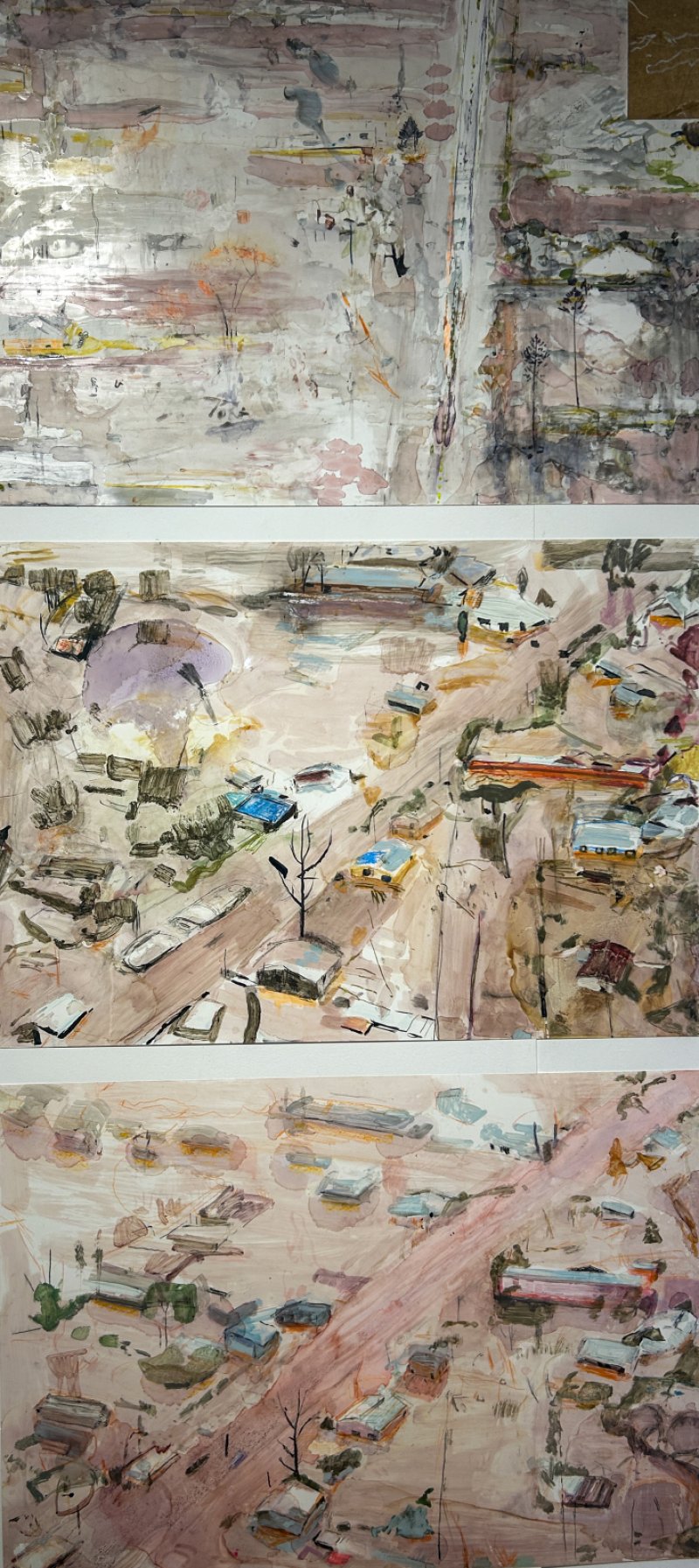 "Het bovenste werk maakte ik drie jaar geleden, wat iets heel vertellend heeft in al die kleine elementen. Ook hier zie je een verdronken landschap die grotendeels onder water staat. Het werk houdt het midden tussen verschrikking en absolute schoonheid. Het middelste en onderste werk maakte ik later, tijdens mijn residentie in Destelheide. In deze reeks is duidelijk een evolutie voelbaar: tijdens mijn zoektocht besefte ik meer en meer dat je met bijna niets het meeste kan suggereren. Met heel weinig elementen en zo kwam ik tot het derde, onderste werk. Ik wil nog in deze lijn verder werken.